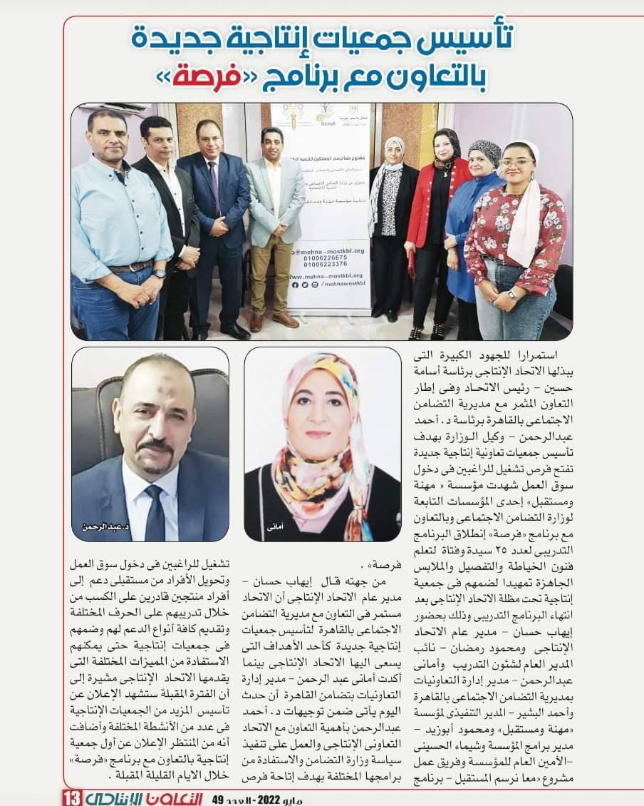 تأسيس جمعية تعاونية إنتاجية لسيدات برنامج فرصة لصناعة الملابس الجاهزة والمفروشات